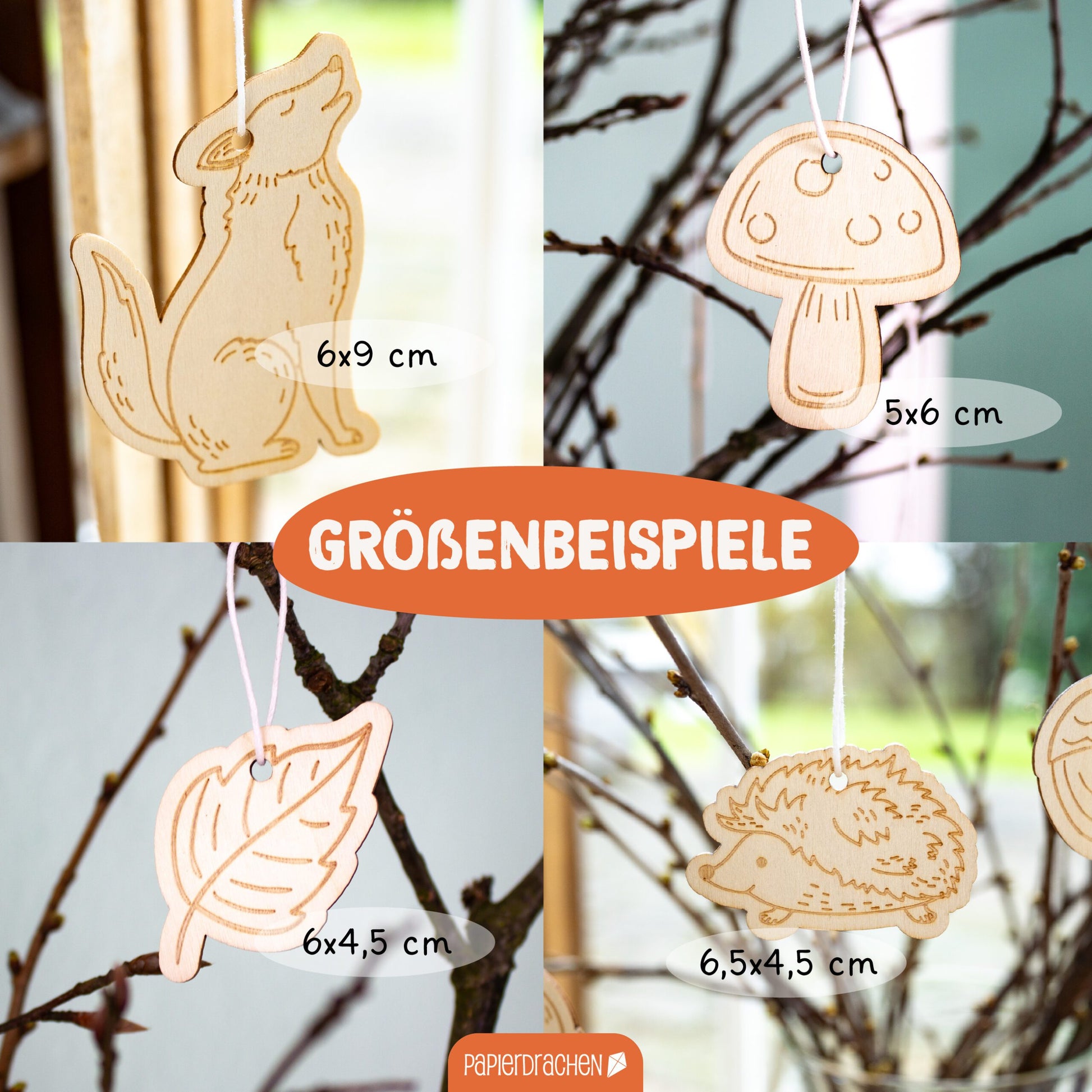 Eine kreative Auszeit für die ganze Familie. Mit diesen 12 Holzanhängern gestaltet ihr eure eigene individuelle Herbstdekoration. Die Anhänger können mit Holzstiften, Wachsmalstiftem, Filzstiften, Wasserfarben, Stickern, Kleber & Glitzer verziert werden und bieten eine Menge Spaß für Kinder und Erwachsene. Jeder Holzanhänger ist mit einem weißen Band fixiert und kann an Zweigen oder Fenstern aufgehangen werden.