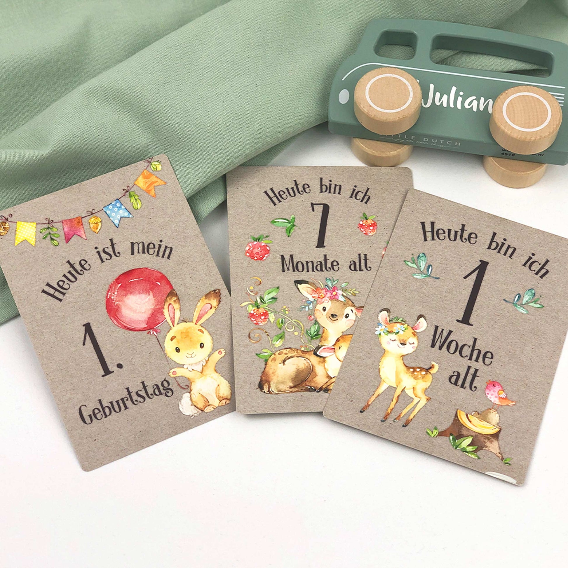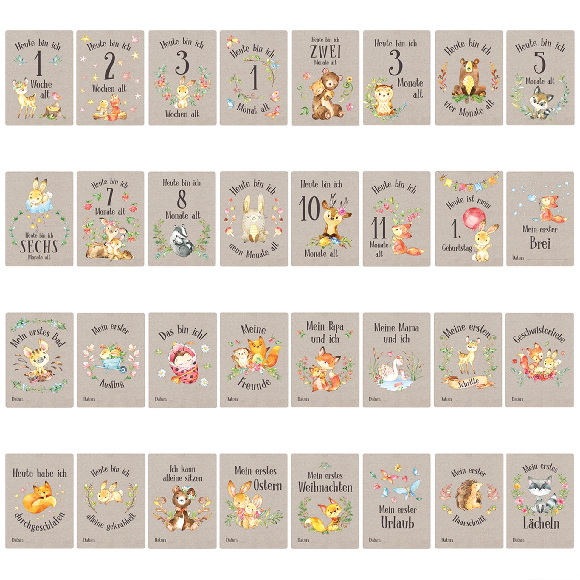 Sie werden so schnell groß. Um jeden Moment für die Ewigkeit festzuhalten, erhältst du hier 32 kindgerechte, mit kleinen Waldtieren bedruckte, liebevolle Meilensteinkarten für Jungen und Mädchen.