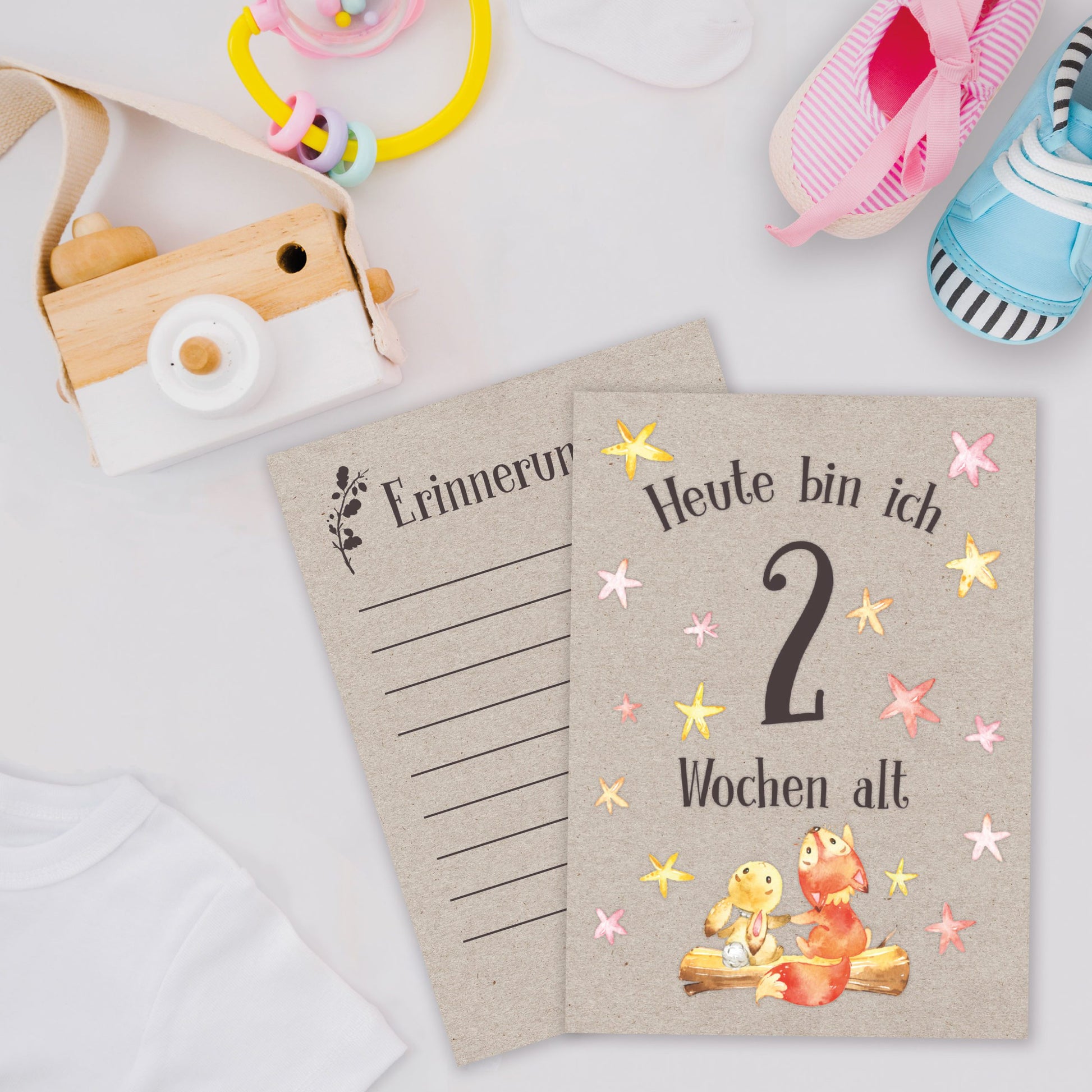 Für die ersten 3 Wochen gibt es jeweils eine Karte sowie für die Monate 1-11 bis hin zum ersten Geburtstag. Für jeden Meilenstein machst du ein Foto von deinem Baby mit der jeweiligen Karte und schaffst so eine Grundlage für wundervolle Erinnerungen. Jede Karte ist hochwertig bedruckt und hat abgerundete Ecken, sodass das Kind sich nicht verletzen kann.