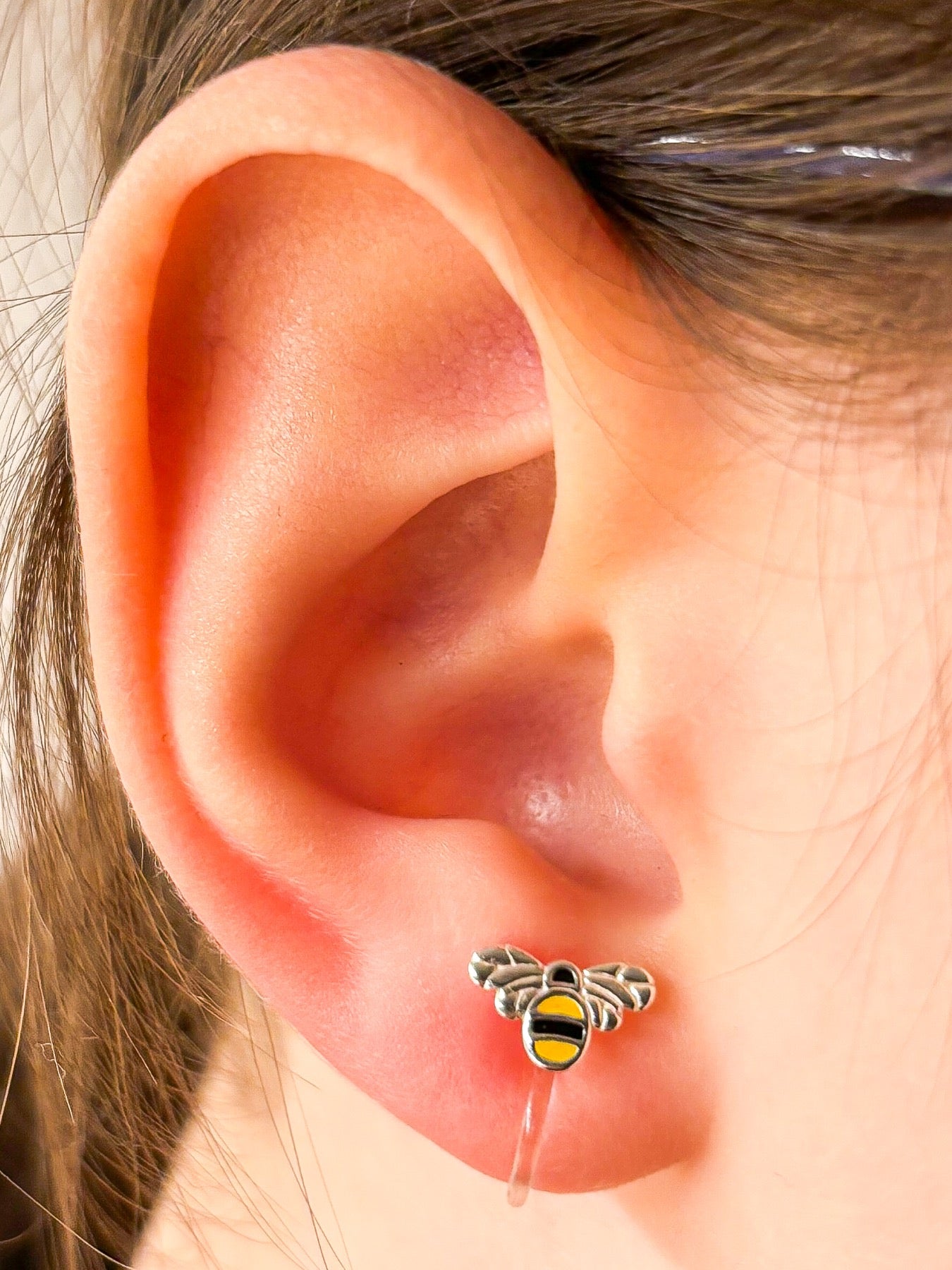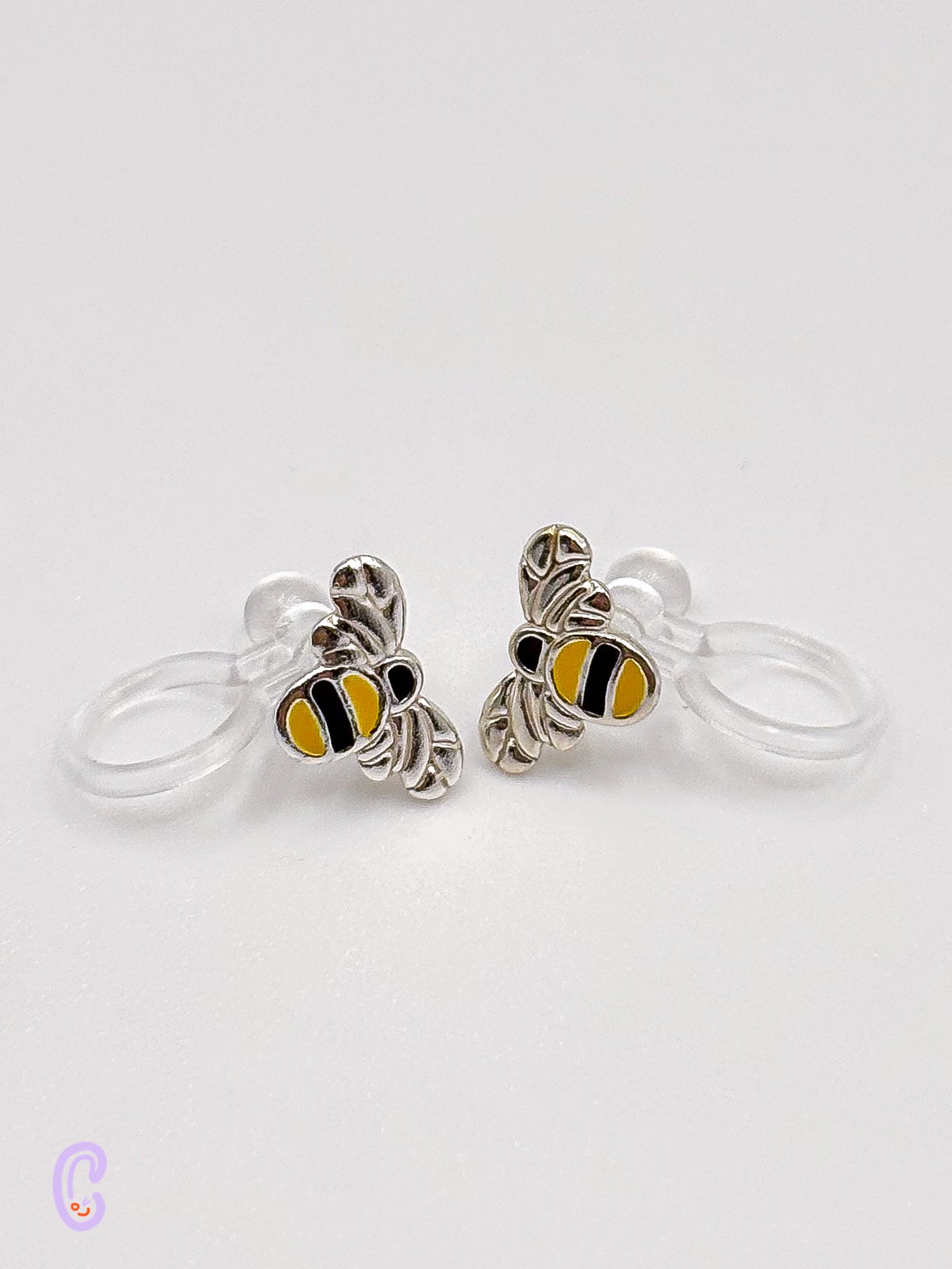 Süße bunte Bienchen Ohrclips aus Echtsilber für Kinder, lassen sich jedem Ohrläppchen individuell anpassen & sehen aus wie richtige Ohrstecker.
