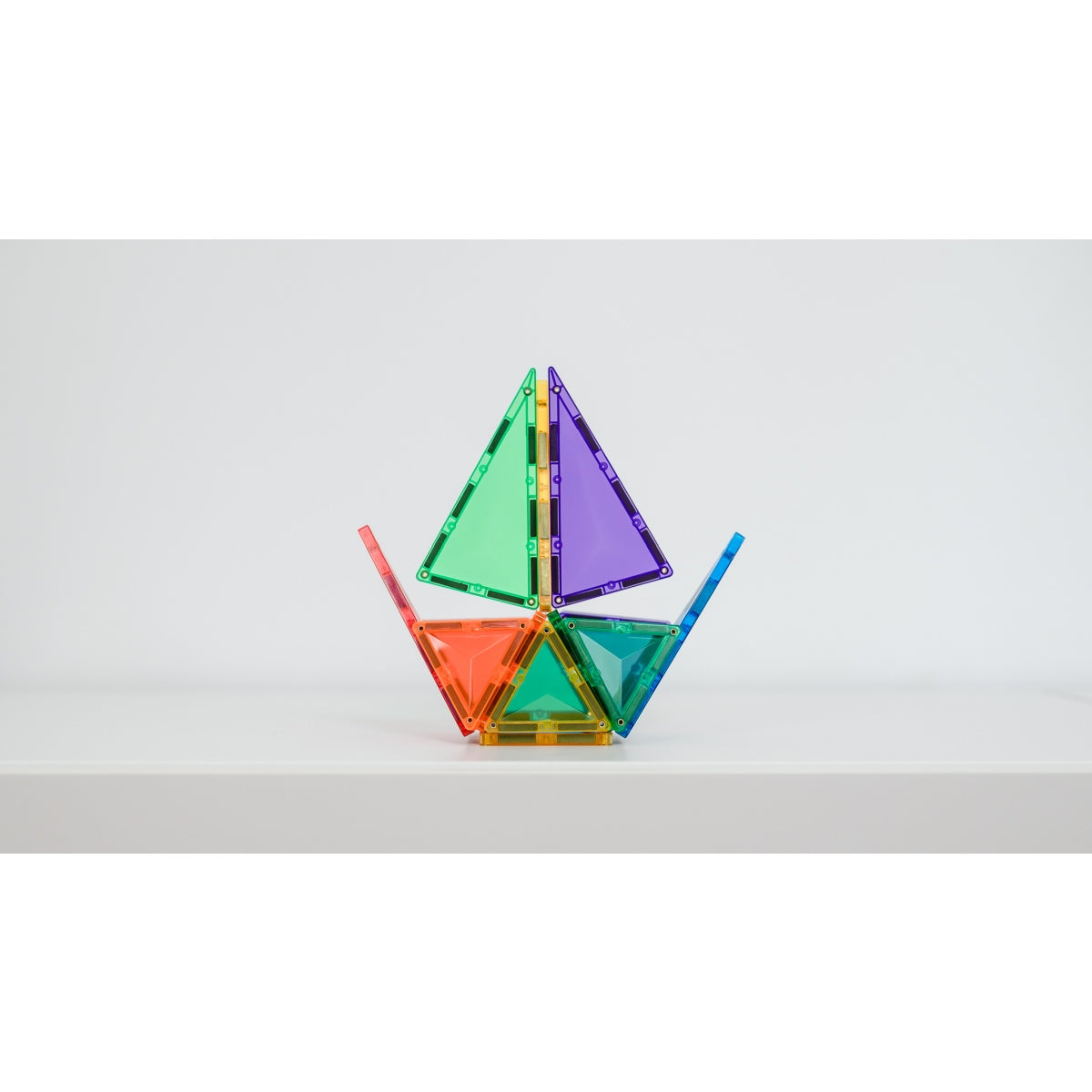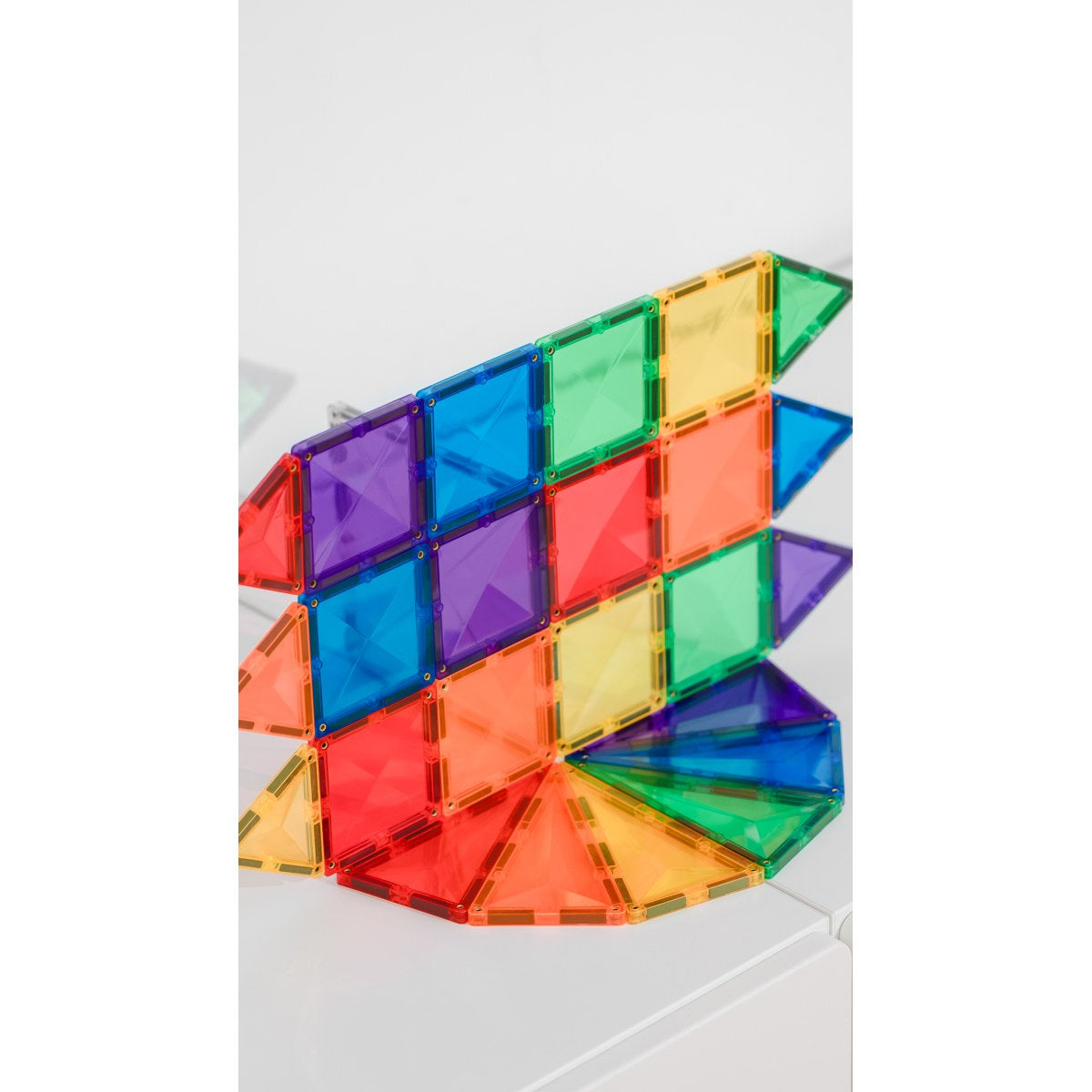 24-TEILIGES SET - Enthält 12 x kleine Quadrate, 6 x gleichseitige Dreiecke und 6 x gleichschenklige Dreiecke in lebendigen Regenbogenfarben. Alle Bausteine verfügen über das einzigartige, abgeschrägte Design, das Stärke verleiht und gleichzeitig schöne klare Lichtbrechungen bietet.