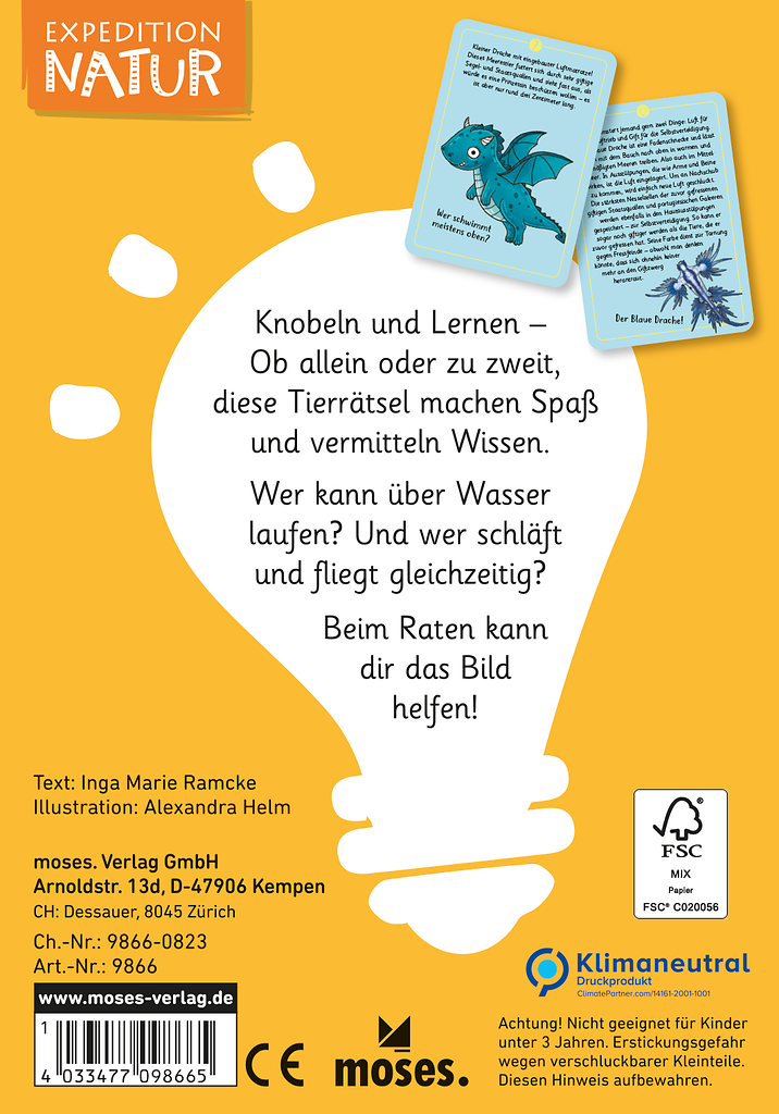 Die Expedition Natur Tierrätsel bieten eine etwas andere Art der Wissensvermittlung. Humorvoll und leicht wird Naturwissen für Kinder ab 8 Jahren vermittelt. Knobeln und lernen – mit diesen Rätseln können Kinder ihr Wissen über Tiere testen und gleichzeitig erweitern. Nach einer rätselhaften Beschreibung eines Tieres kann die Illustration vielleicht noch einen kleinen Hinweis geben. Welches Tier steckt wohl dahinter? Ein Blick auf die Rückseite verrät es und gibt noch zusätzliche Informationen über das fantastische Tier.