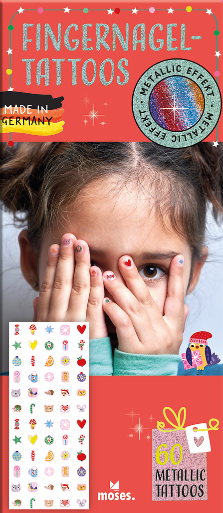 Die 60 Mini-Tattoos mit Metallic-Effekt lassen sich kinderleicht anbringen: Motiv ausschneiden, Trägerfolie abziehen, kurz mit Wasser andrücken – fertig ist der weihnachtliche Nagel-Look. Ideal für Kinderhände, kleine Partys oder als kreative Beschäftigung in der Adventszeit.