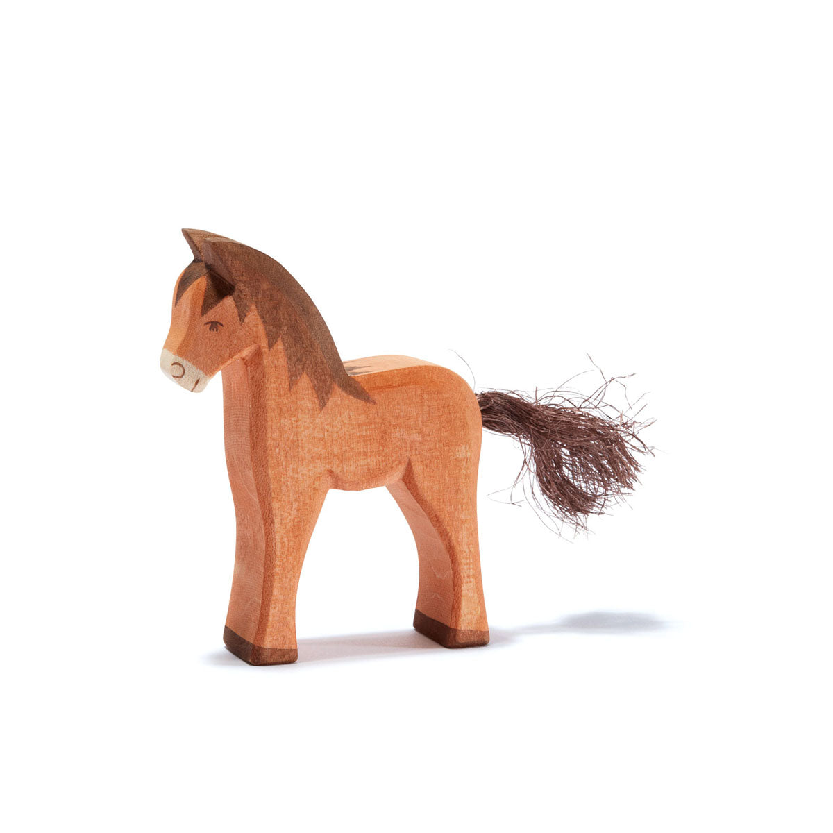 Holztier "Fohlen braun". Süßes, verspieltes Holz-Fohlen vom großen Ostheimer Pferdehof. Wertvolles, die Fantasie sanft anregendes Holzspielzeug.