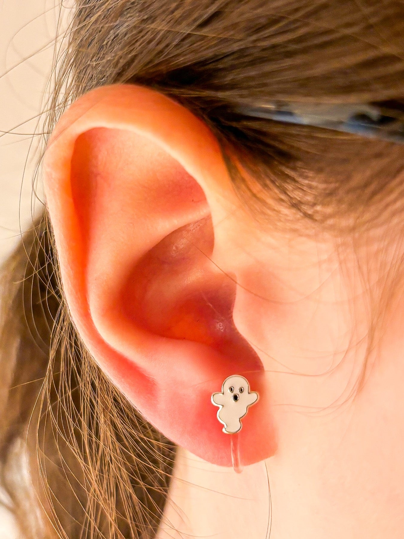 Süße Geister Ohrclips aus Echtsilber für Kinder, lassen sich jedem Ohrläppchen individuell anpassen & sehen aus wie richtige Ohrstecker.