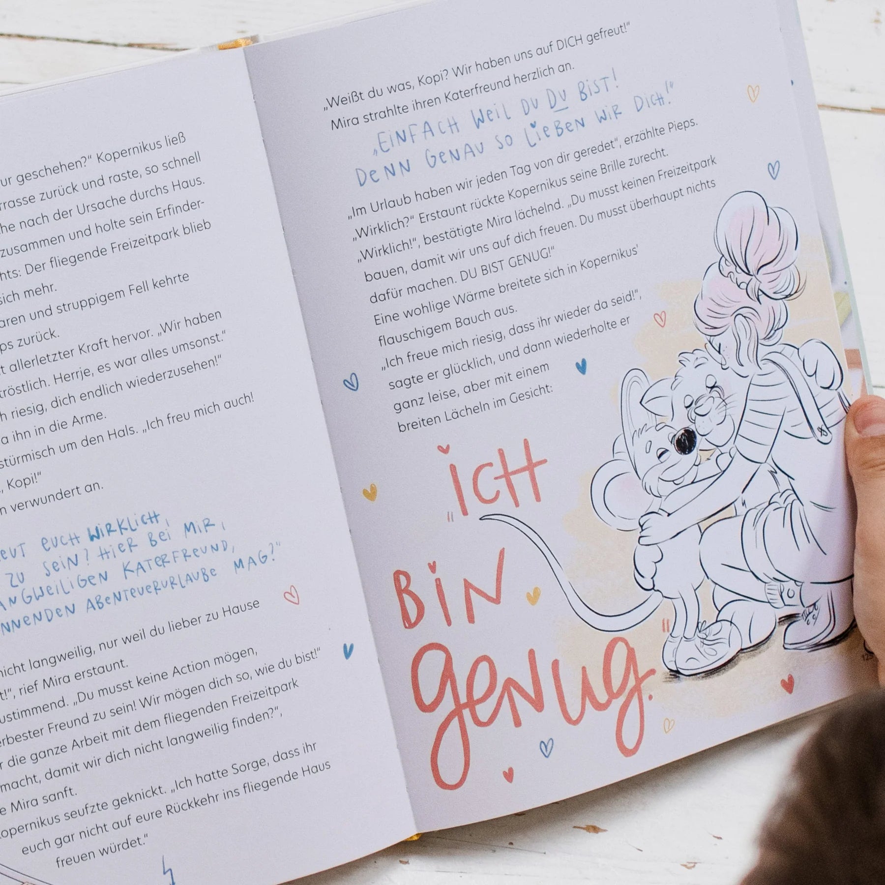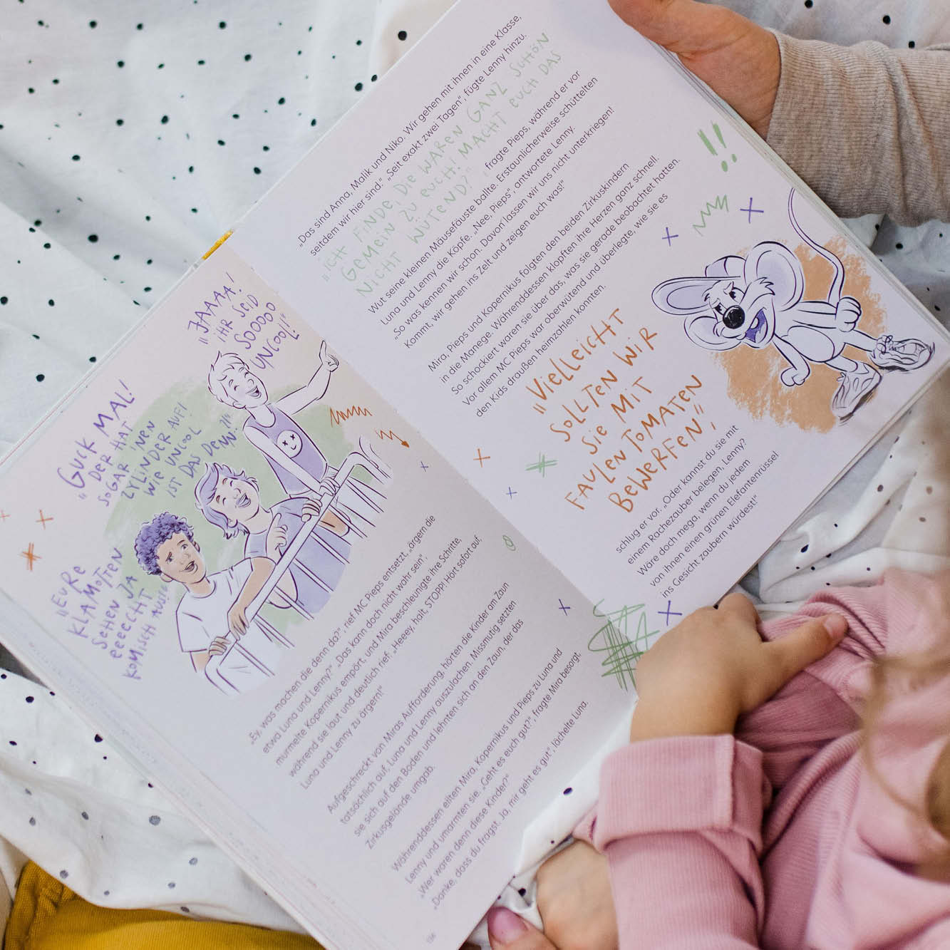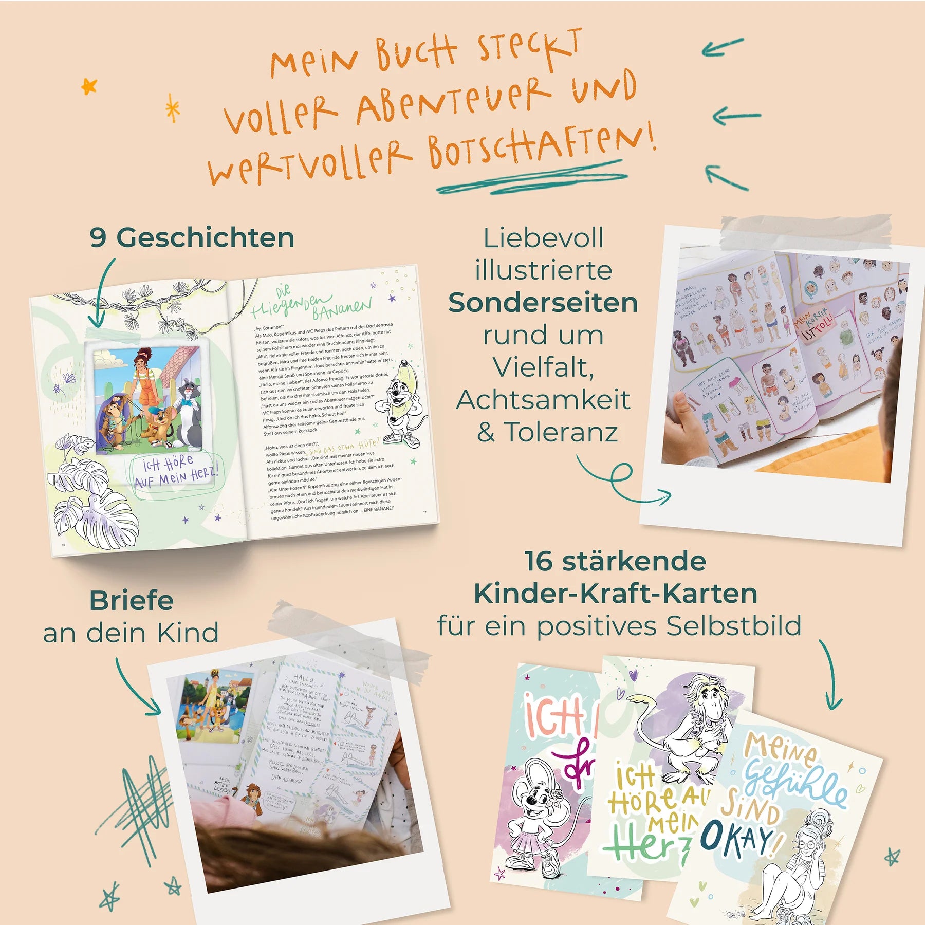 Dein Kind bekommt nach jeder Geschichte einen Brief von MiRA, Kopernikus, MC Pieps oder ihren Freunden. So wird es persönlich angesprochen und bekommt außerdem Ideen, wie es den Kraftsatz aus der Geschichte ins eigene Leben übertragen kann. Als zusätzliches Geschenk gibt es 16 heraustrennbare Kinder-Kraft-Karten und wunderschön illustrierte Sonderseiten, welche die Vielfalt des Themas sichtbar machen und auf denen dein Kind eine Menge entdecken kann. Der perfekte Türöffner für super wertvolle Herzensgespräche in der Familie!
