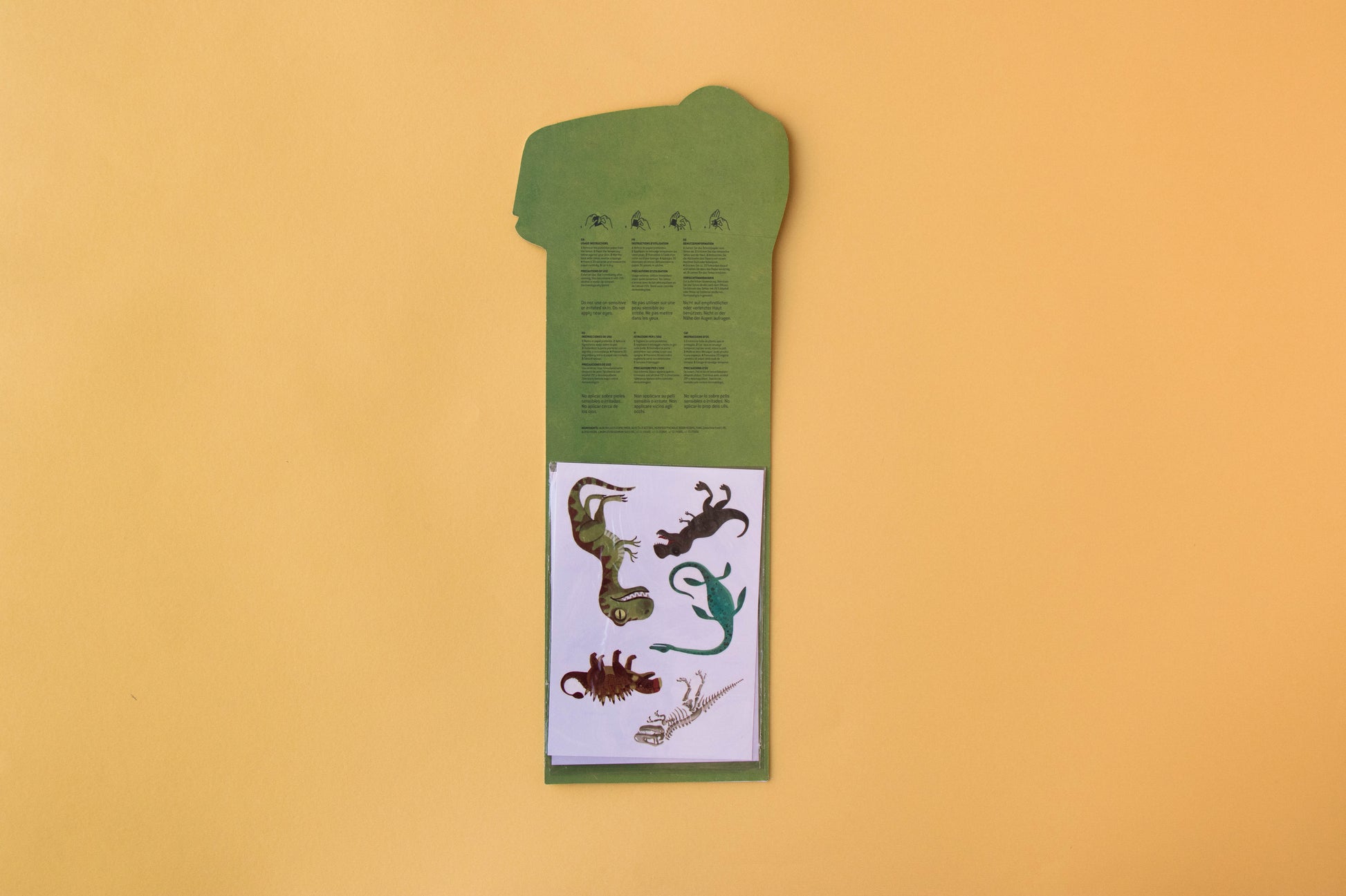 Zehn temporäre Dinosaurier-Tattoos, die Sie überall auf dem Körper angebracht werden können. Dermatologisch getestet. Ideal für Dino-Mottopartys.