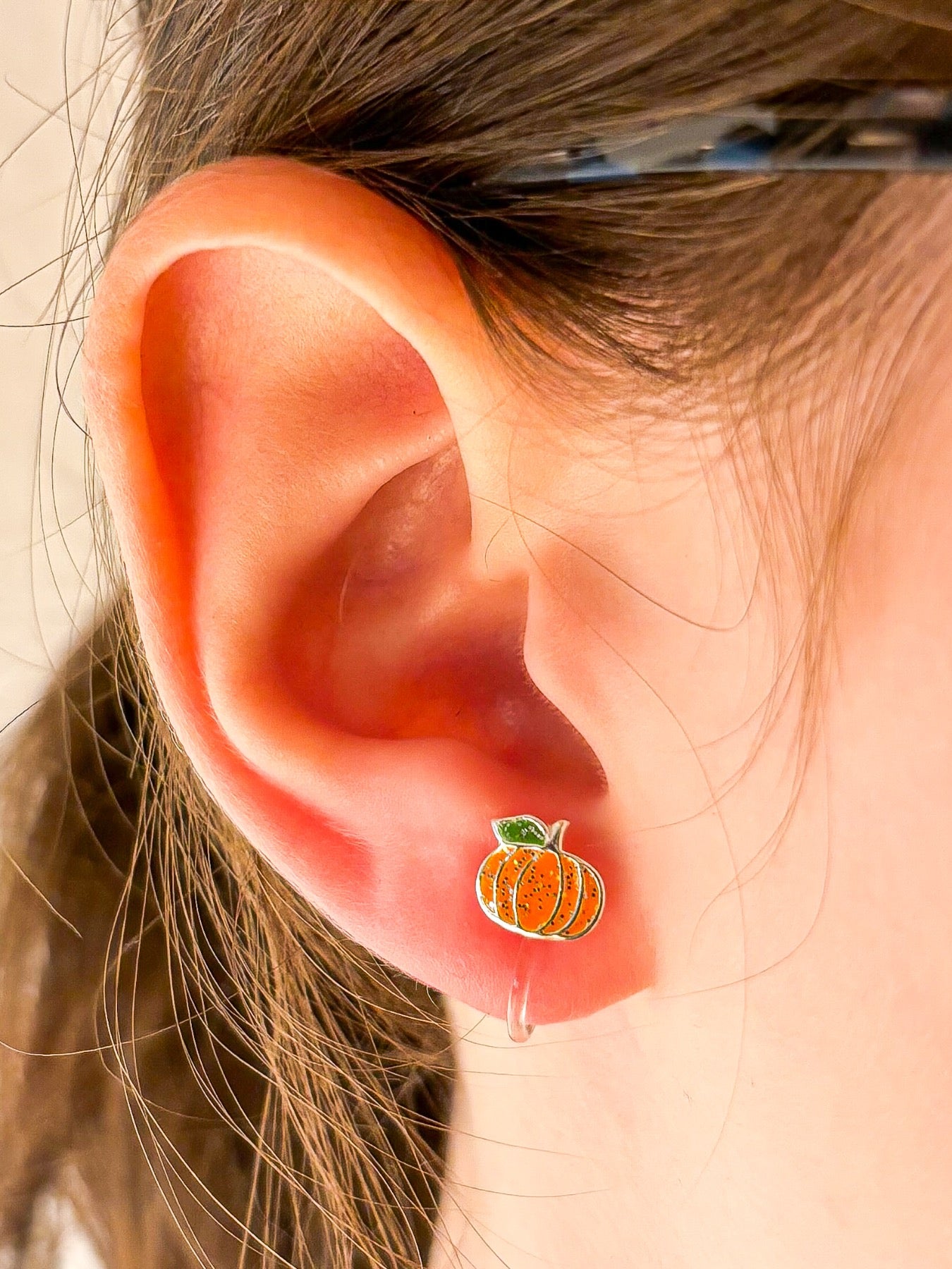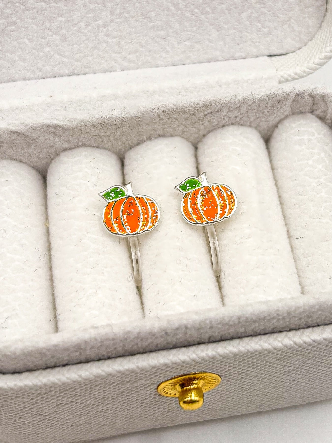 Süße Glitzer Kürbis Ohrclips aus Echtsilber für Kinder, lassen sich jedem Ohrläppchen individuell anpassen & sehen aus wie richtige Ohrstecker.