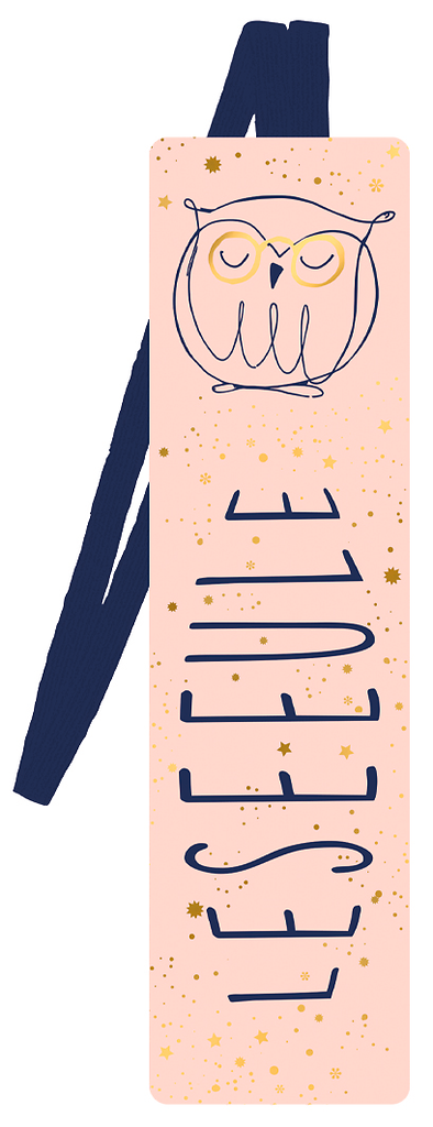 Nächtliche Lesestunden sind wohl die gemütlichsten. Wie passend also, dass dieses schöne Lesezeichen in sanftem Puderrosa von einer nachtaktiven Eule geschmückt wird! Das edle Design mit dunkelblauer Zeichnung einer niedlichen Eule samt goldener Lesebrille wird geziert von gold-veredelten Punkten sowie dem Schriftzug „Leseeule“. Das Band des Lesezeichens ist ebenfalls in Dunkelblau gehalten und rundet so das stimmige Farbbild ab. Ein Muss für alle, die vor dem Schlafengehen zum Lieblingsbuch greifen und ein tolles Geeschenk für stilvolle Leser*innen!