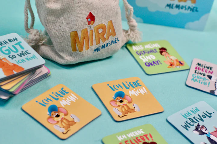 Mit dem MiRA-Memospiel bringt ihr positive Glaubenssätze spielerisch in euren Familienalltag. Bestehend aus 20 liebevoll gestalteten Kärtchen (5,5 auf 5,5 cm) im Leinensäckchen und einer Spielanleitung mit verschiedenen Spielvarianten.