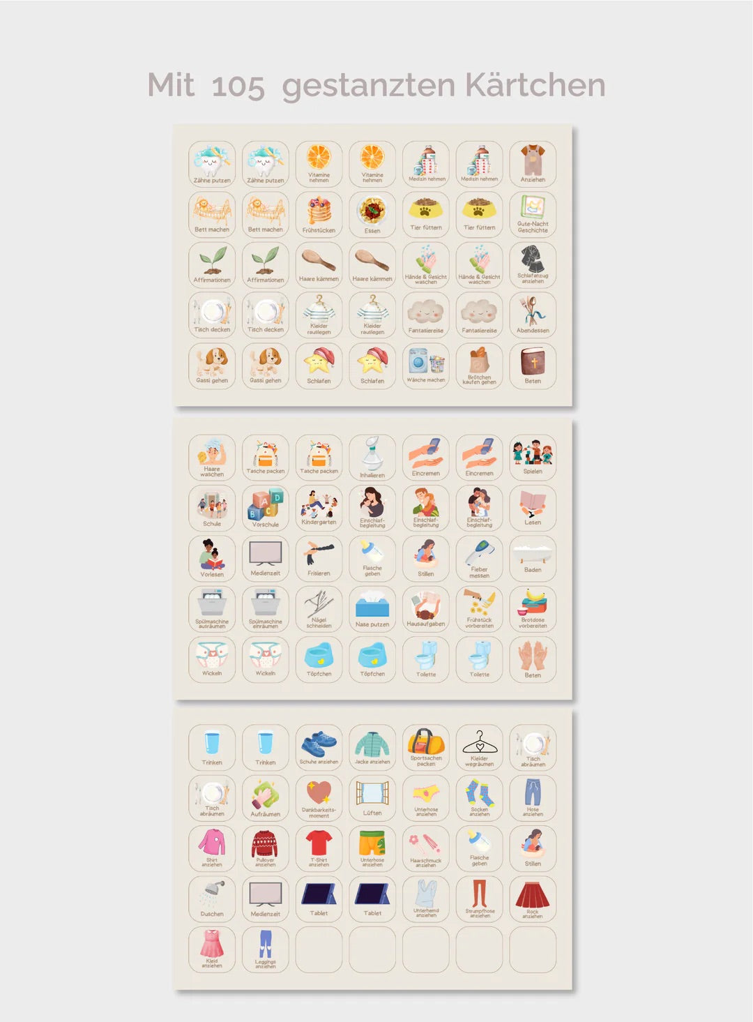 Die 140 hochwertigen, laminierten Kärtchen sind langlebig, stabil und liebevoll gestaltet. Sie decken alle wichtigen Aufgaben für den Morgen und Abend ab und lassen sich flexibel an die Bedürfnisse Deines Kindes anpassen.