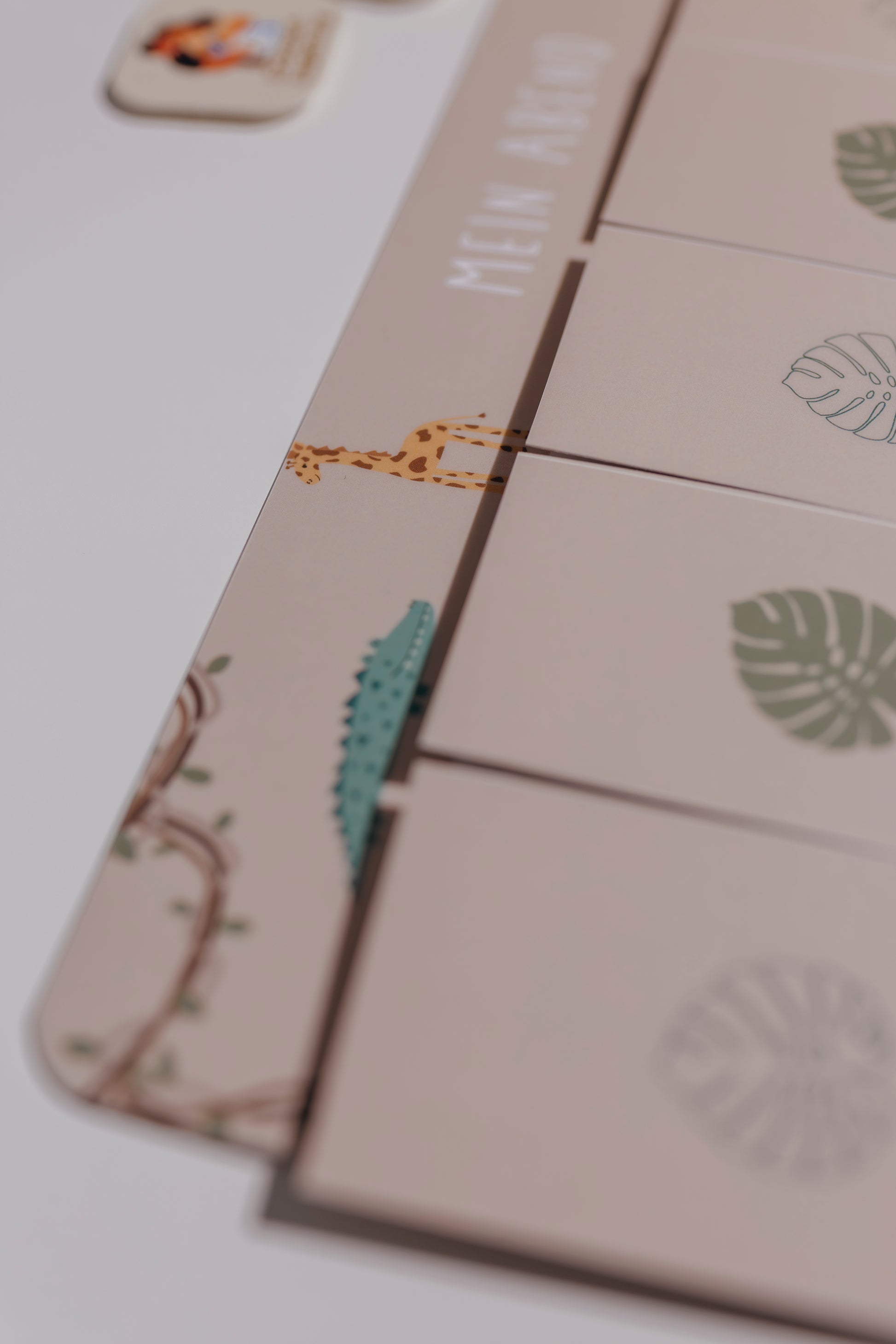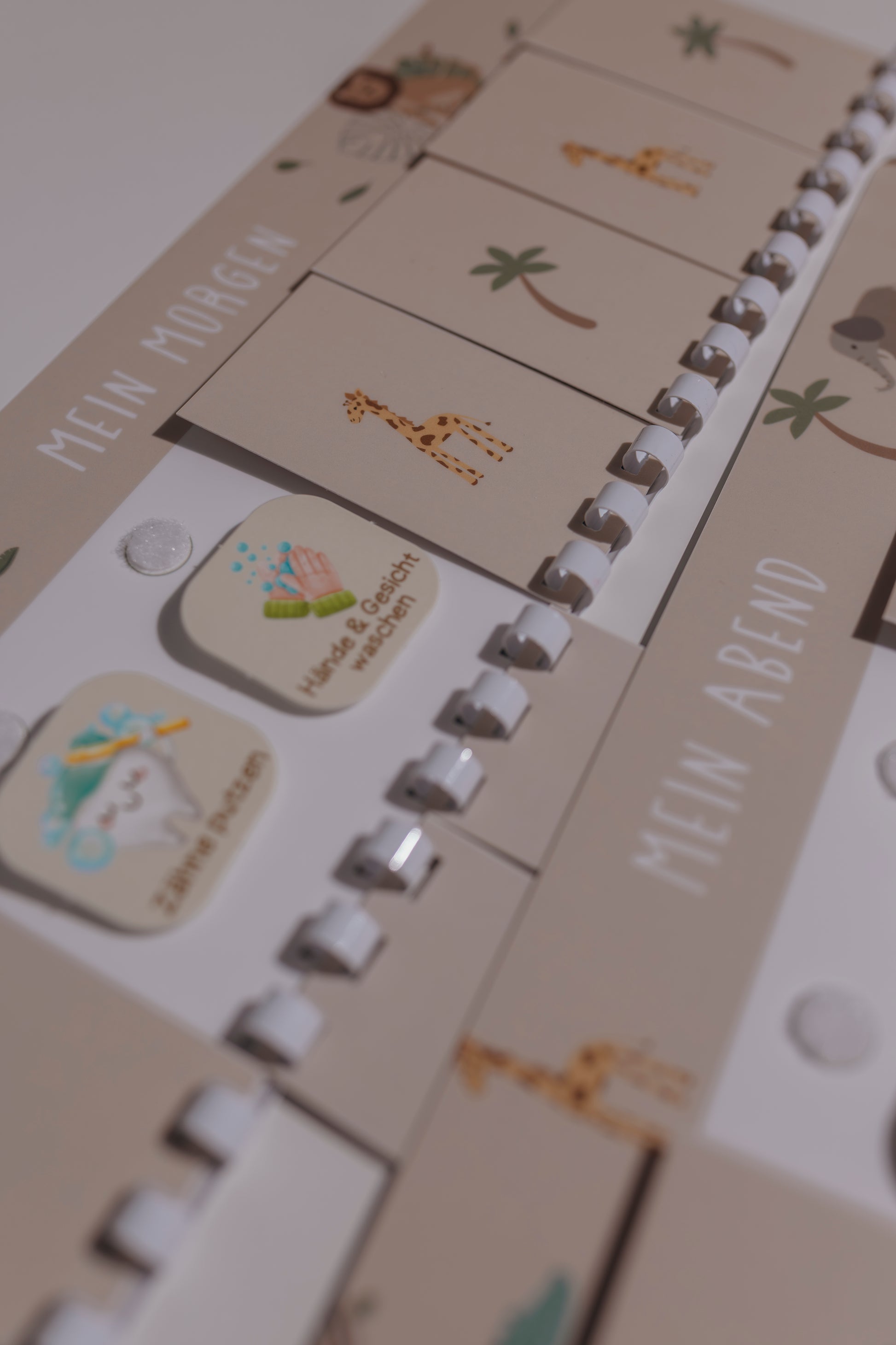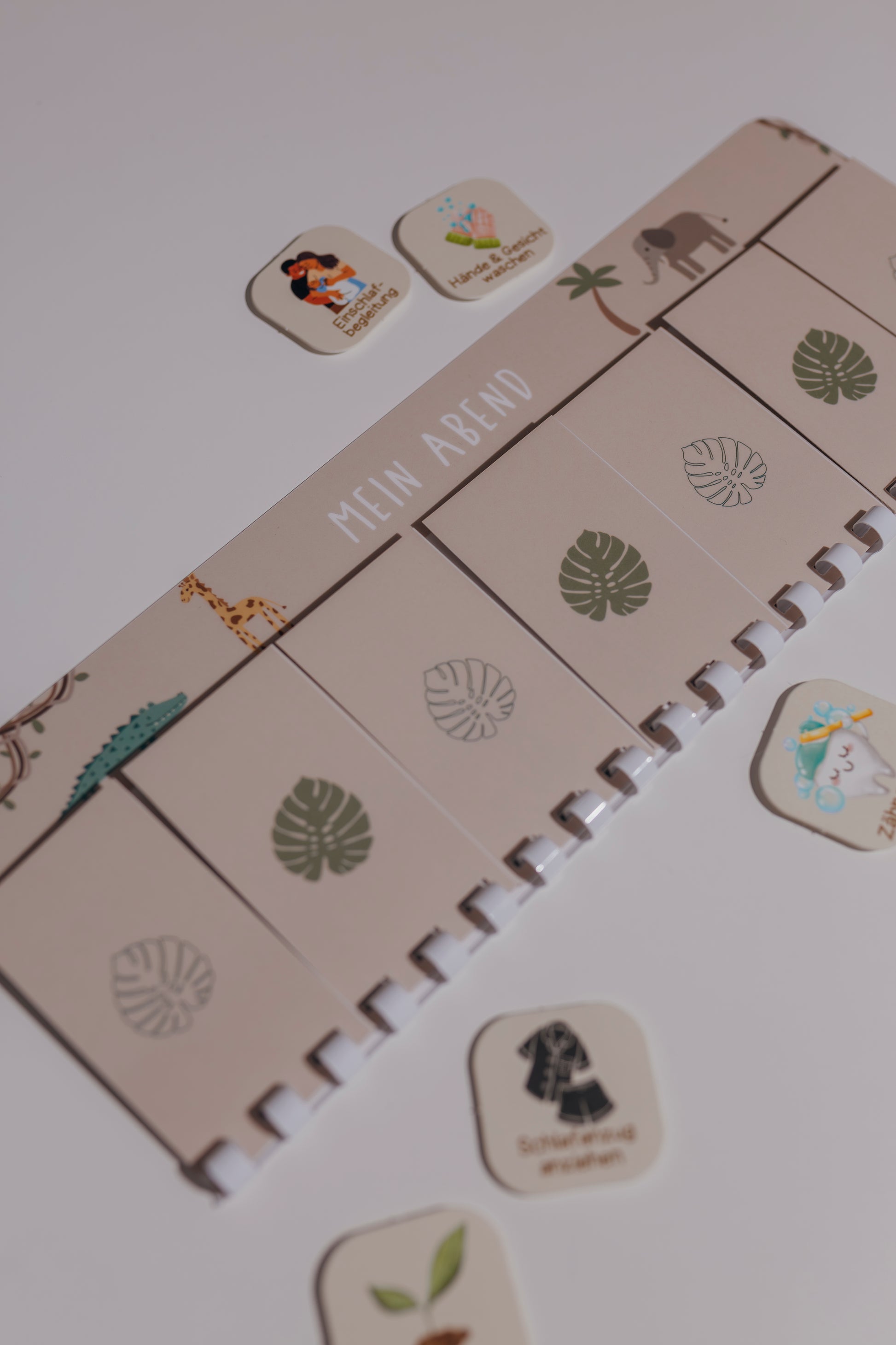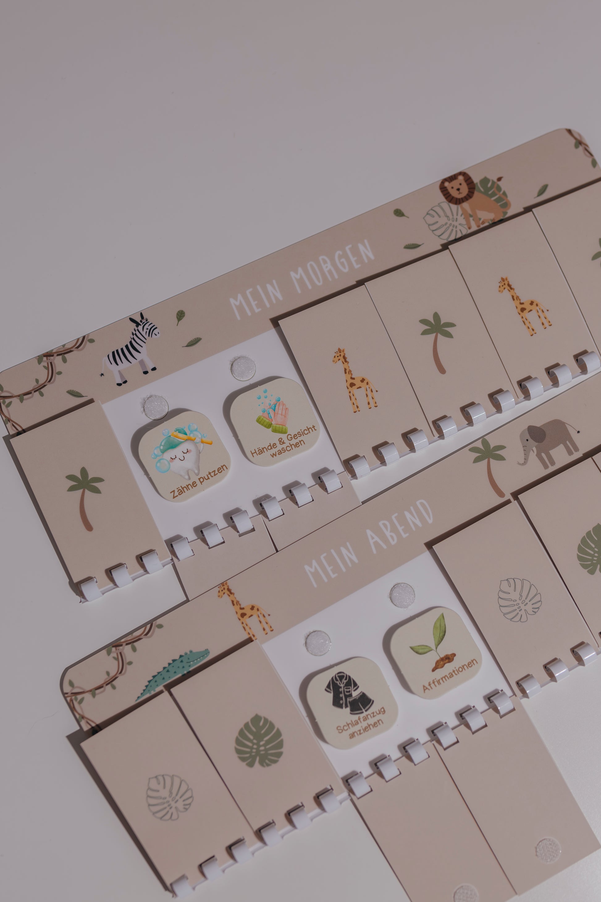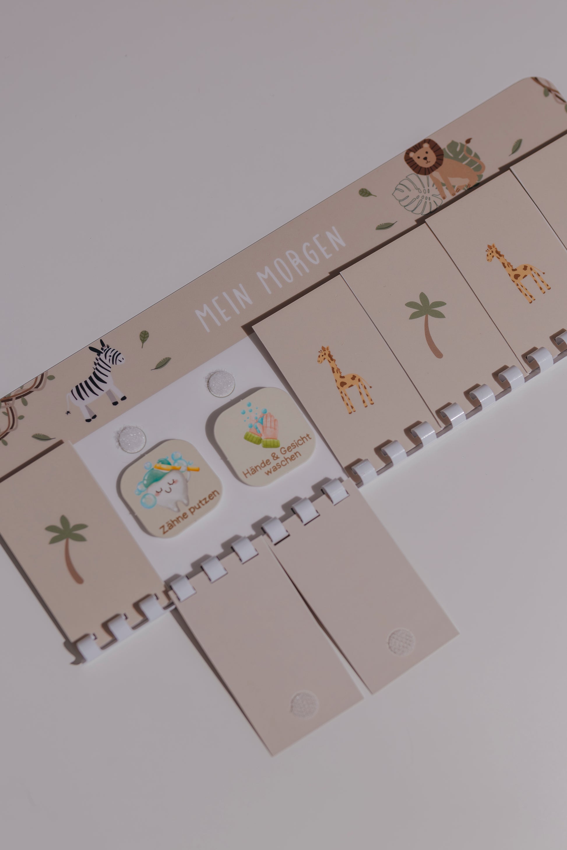 Unsere Morgen- und Abendroutine hilft Kindern, den Tag strukturiert und spielerisch zu gestalten. Dank der klaren, bildlichen Darstellung fällt es den Kleinen leicht, sich an die Routine zu gewöhnen und jeden Schritt nacheinander zu erledigen. Sobald eine Aufgabe abgeschlossen ist, können sie diese zuklappen – so behalten sie immer den Überblick, was noch zu tun ist.
