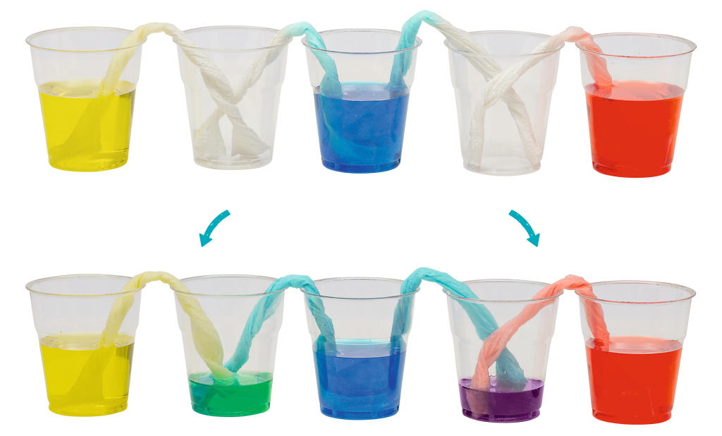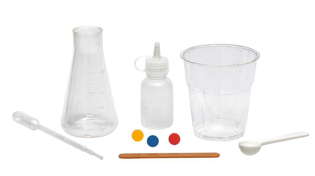 + mit verschiedenen Farbtabletten, 3 Fläschchen, 6 Plastikbechern, Pipette, Erlenmeyerkolben, Rührstab, Portionierlöffel, Anleitung und Hintergrundinformationen zur additiven Farblehre