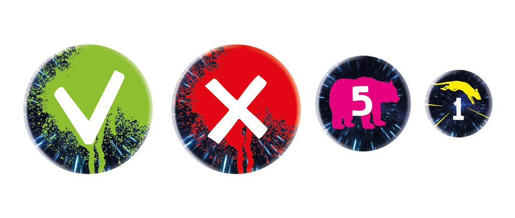 54 Punktechipps, 6 Abspieltäfelchen, 1 Spielanleitung
