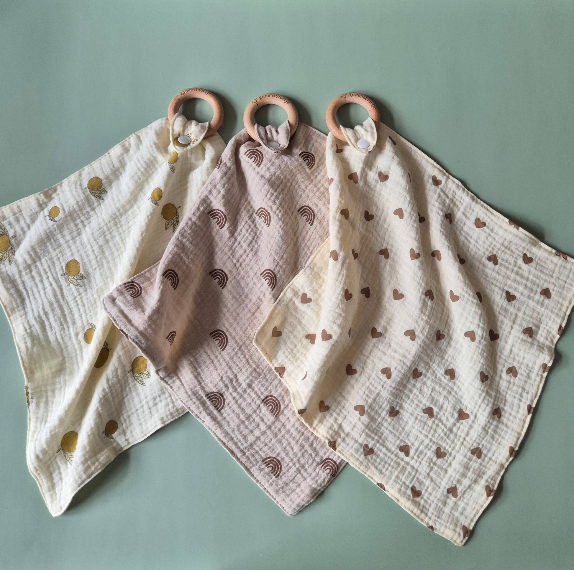 Kuscheltuch mit Beißring aus Buchenholz Weicher, hydrophiler Stoff mit einem Beißring aus Holz. Ein schönes Kuscheltuch zum Kuscheln in weichen und neutralen Tönen! Die Tücher sind ca. 30 x 30 cm groß und verfügen über einen Druckknopf. Sie können bei 30 Grad Celsius gewaschen werden. (Bitte vorher den Holzring entfernen)