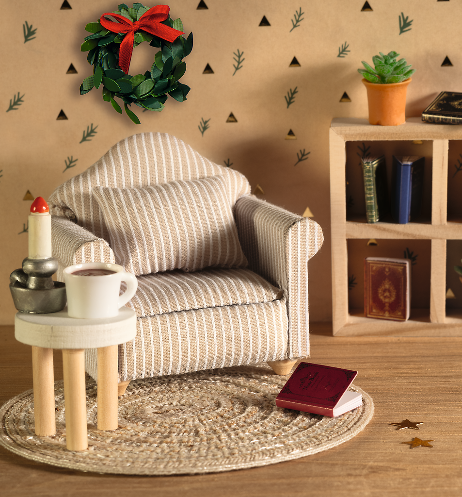 Ob draußen im verschneiten Garten oder drinnen in der warmen Stube – mit diesen liebevoll gestalteten Mini-Accessoires erwacht die Wichtelwelt zum Leben. Die Sets enthalten alles, was Wichtel für ihre winterlichen Abenteuer brauchen: Im Garten warten Bank, Schubkarre, Schneemann und ein Tannenbäumchen, während in der Stube ein gemütlicher Sessel, Teppich, Regal und Kerze für Behaglichkeit sorgen.