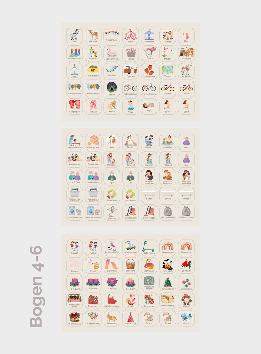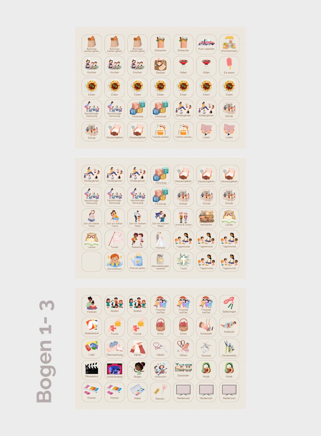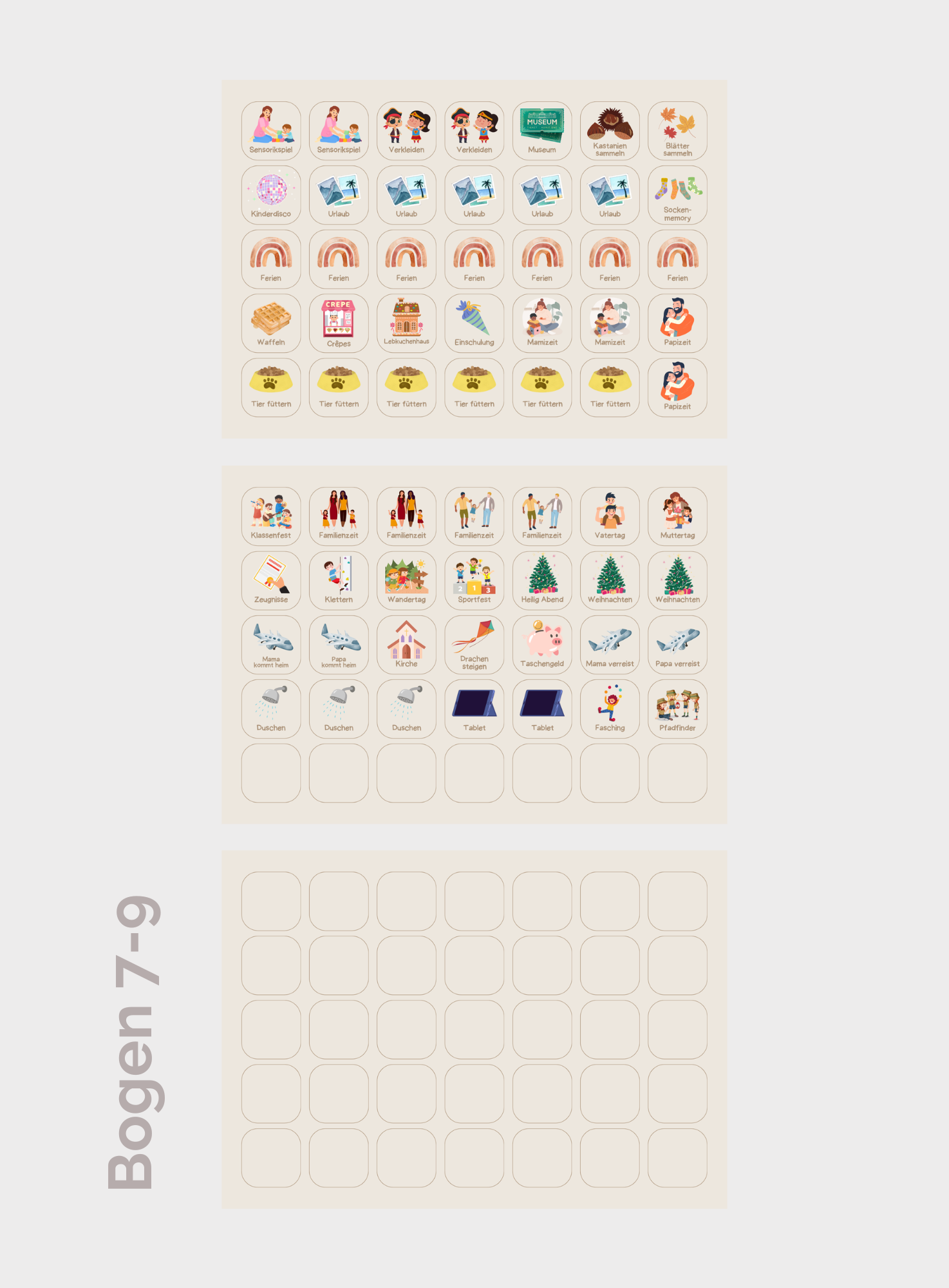 Der Wochenplaner enthält 9 Bögen mit insgesamt 315 Kärtchen, die gestanzt und knickfest sind. Ein ganzer Bogen ist unbedruckt (beige), sodass Du mit Folienstiften eigene Motive oder Aufgaben gestalten kannst – perfekt für individuelle Anpassungen.