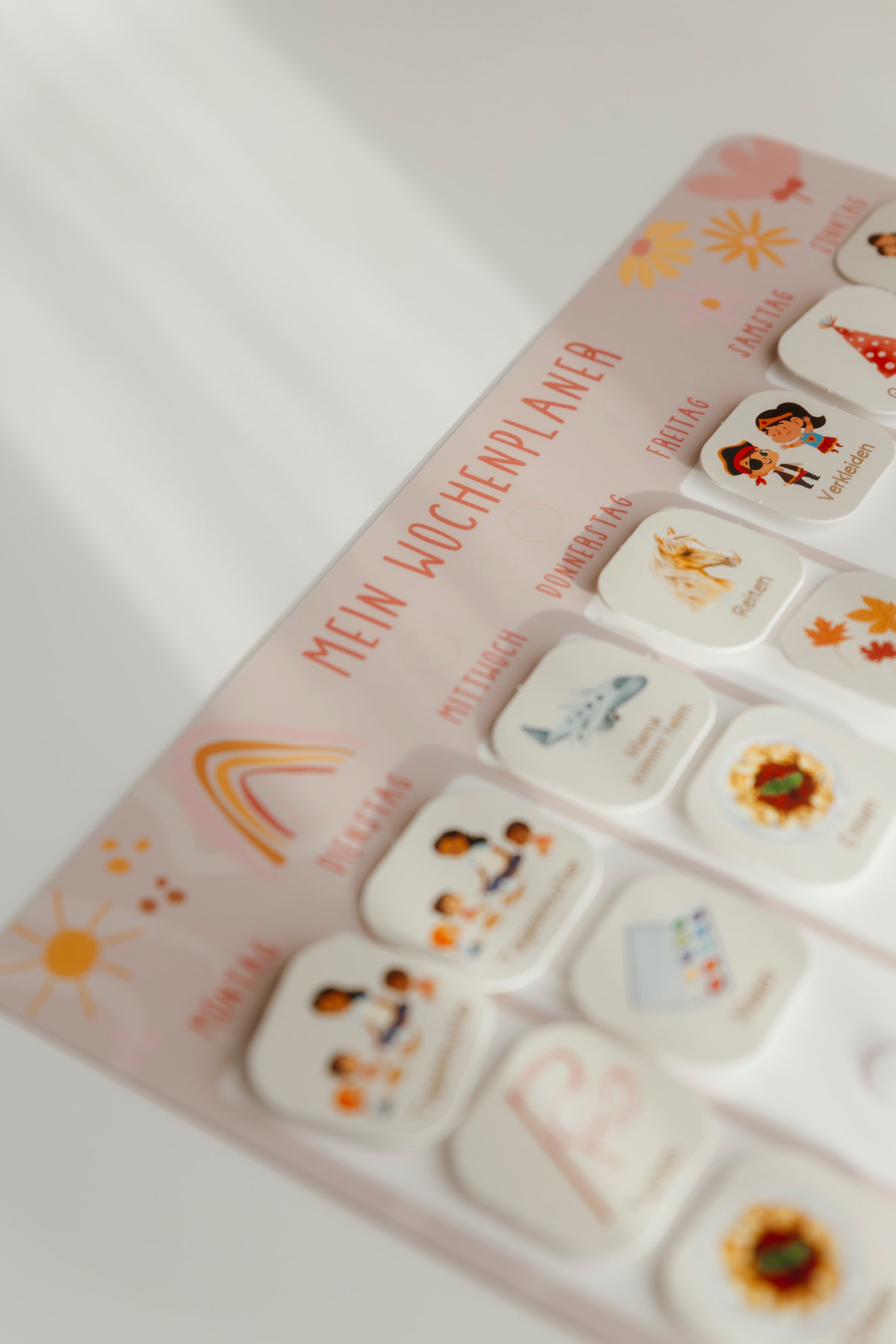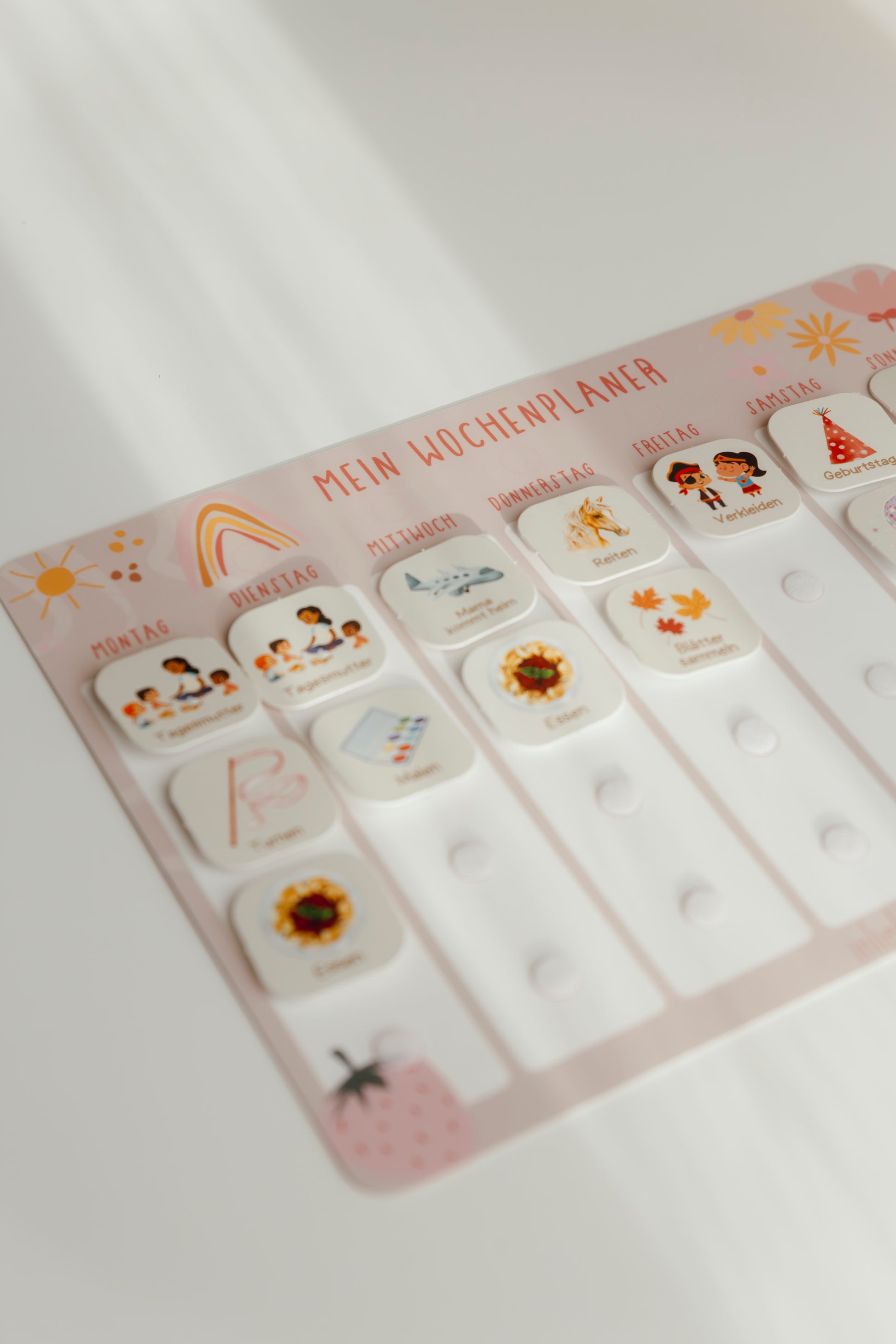 Die Kärtchen werden gestanzt geliefert und sind mit ausreichend Klettpunkten versehen, damit sie leicht auf dem Planer angebracht und jederzeit neu arrangiert werden können. Die Kombination aus farbenfrohen, vorgefertigten Kärtchen und eigenen Kreationen macht die Wochenplanung zu einem kreativen Erlebnis für die ganze Familie.