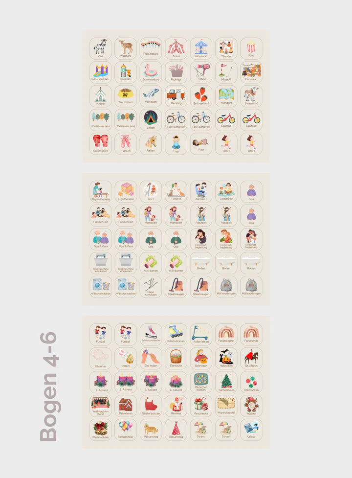 Der Wochenplaner enthält 9 Bögen mit insgesamt 315 Kärtchen, die gestanzt und knickfest sind. Ein ganzer Bogen ist unbedruckt (beige), sodass Du mit Folienstiften eigene Motive oder Aufgaben gestalten kannst – perfekt für individuelle Anpassungen.